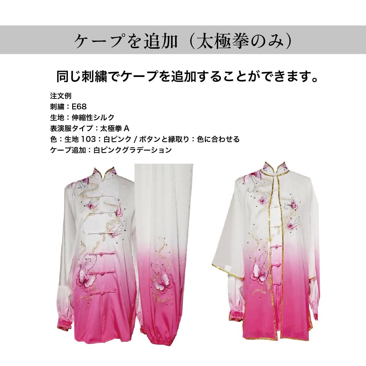 太極拳表演服をお買い上げの方はプラス¥4,500で同刺繍のケープが購入いただけます。(同時注文に限ります)